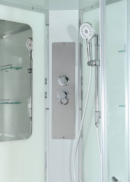 Стильная душевая кабина AvaCan сочетает в себе высокую функциональность, практичность и надежность. При изготовлении применяется безопасное закаленное стекло, надежно фиксируемое алюминиевым профилем. Профиль сделан из алюминия повышенной прочности. Сборка без силикона (увеличивает срок службы, защищает от протечек), внутренняя сборка (облегчает установку и ревизию; позволяет установить в ограниченном пространстве и обойтись без демонтажа других сантехнических приборов), смеситель резьбовой (без хомутов). Двойные металлические ролики дверей (распределение нагрузки на два ролика, увеличивают срок службы). Душевая штанга(позволяет регулировать по высоте ручную лейку), ручная арома-лейка с витамином С (картридж в комплекте,есть возможность замены или удаления картриджа), полочки(из стекла, с ограничителем), сифон с гидрозатвором.