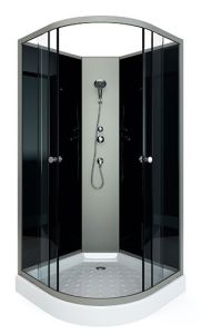 поддон низкий 15см фронтальные стекла: тонированные задние стекла: черные задняя панель : серебро пластик профиль серебро регулируемые ролики хромированные ручки для дверей смеситель, ручная лейка слив с сифоном