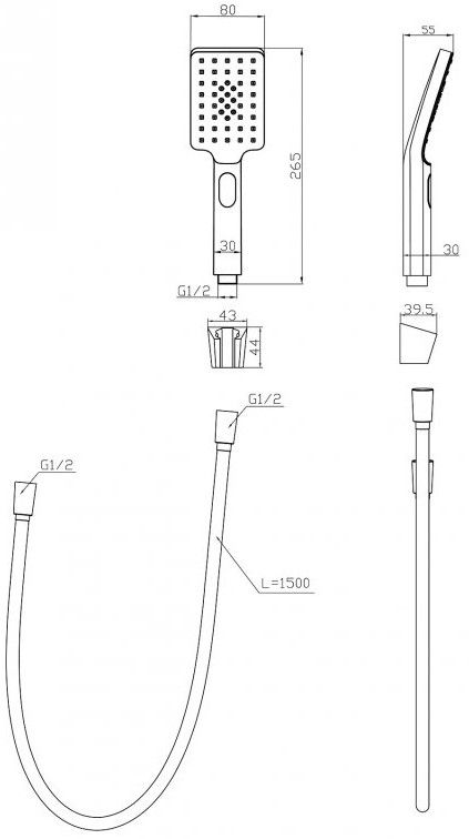 Оснащение: держатель, душевой шланг PVC 150 см, ручной душ АБС-пластик