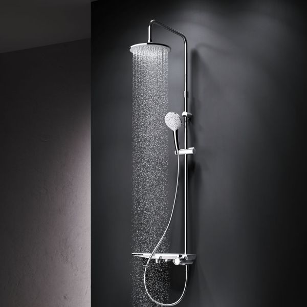 Долгожданное пополнение культовой коллекции Gem — Душевая система с ванно-душевым смесителем-полкой.Все детали душевой системы – от пропорций ручного и верхнего душей до рисунка расположения форсунок на лейках – подчинены единой концепции в ультрамодном стиле Dynamic Organic. Дизайн разработан всемирно известным агентством Brandis (Германия).Еще больше места для хранения: верхняя часть смесителя выполнена в виде вместительной полочки. Теперь все необходимые душевые принадлежности всегда будут под рукой.Уникальная система управления: регулируйте температуру и напор воды и переключайте потоки между смесителем, ручным и верхним душем поворотом всего одной ручки — управление еще никогда не было таким простым и интуитивно понятным.Продуманные детали для максимального удобства использования: телескопическая штанга регулируется по высоте в диапазоне от 1030 до 1460 мм, обеспечивая комфорт для людей любого роста, душевой шланг 1750 мм с защитой от перекручивания, увеличенный верхний душ диаметром 220 мм, ручной душ диаметром 120 мм.
