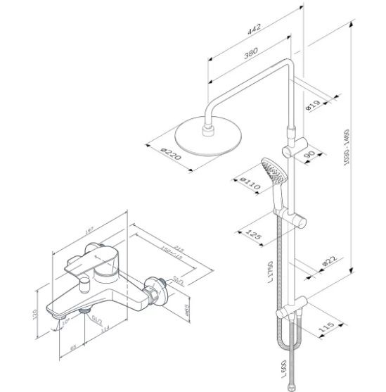 Душевая система Am.Pm Gem F40890A14F40890A14 Gem набор 2в1: см-ль д/ванны/душа, верхний душ d 220 мм, ручн.душ 110 мм, 1 ф-ция, душевая штанга