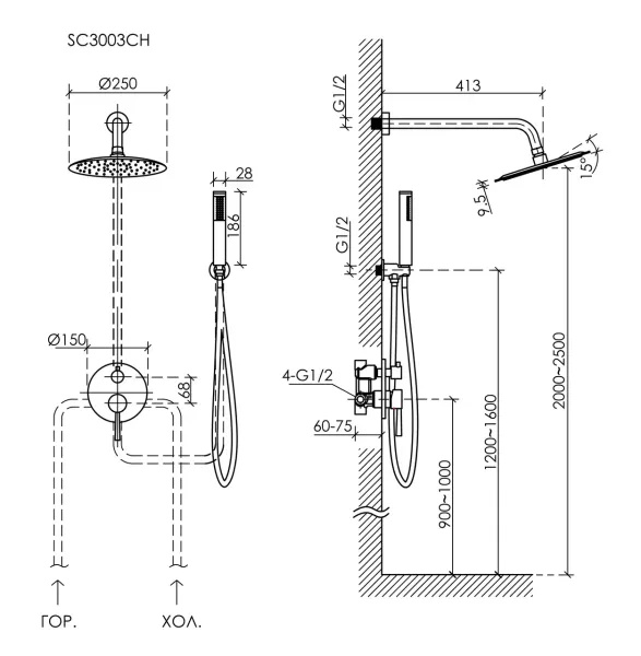Душевой комплект SANCOS Select встраиваемый для душа, с внутренней частью, верхним, ручным душем и шлангом в комплекте, цвет хром, арт. SC3003CH