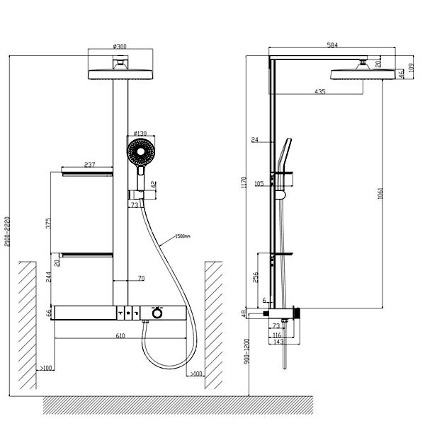 LED дисплей (индикация температуры и времени) на душевой штанге, две полочки из закалённого стекла (237x105 мм).