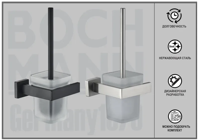 Ванная комната является одним из любимых и часто посещаемых мест человека. Мы проводим там больше 14 тысяч часов за всю жизнь, поэтому она обязательно должна быть не только уютной, но и эргономичной. Ни одна ванная комната не может обойтись без аксессуаров - незаметных на первый взгляд, но совершенно необходимых вещей, которые делают жизнь нашу намного комфортней. Они не только практичны, но и создают общую атмосферу ванной комнаты, придают ей индивидуальность и шарм.Дизайнерские аксессуары BOCH MANN стилистически завершают образ ванной комнаты, создавая целостную и продуманную концепцию. Их функциональный дизайн позволяет дополнить практически любой интерьер, а широкий ассортимент предоставляет свободу выбора. Так как срок службы аксессуаров для ванных и туалетных комнат напрямую зависит от материала, из которого они изготовлены, в производстве аксессуаров BOCH MANN используются только материалы самого высокого качества – нержавеющая сталь и закалённое стекло. Изделия из нержавеющей стали — рекордсмены по сроку службы, сохранению отличного внешнего вида и высоких эксплуатационных характеристик. Надежность конструкций аксессуаров BOCH MANN, профессиональное крепление и прочность покрытия позволяют использовать изделия не только в домашних условиях, но также и в общественных местах, включая отели и рестораны. Безупречность исполнения каждой детали, точность даже в мелочах — это признаки истинной элитарности бренда BOCH MANN. Преимущества:- эстетический внешний вид;- высококачественные материалы – нержавеющая сталь и закаленное стекло;- тип крепления – скрытый, отличающийся повышенной надёжностью;- два варианта цветов – классический черный и универсальный хром;- чёткие формы каждой детали;- качество, проверенное годами. Внимание! Производитель оставляет за собой право вносить изменения в конструкцию и комплектацию моделей без предварительного уведомления!