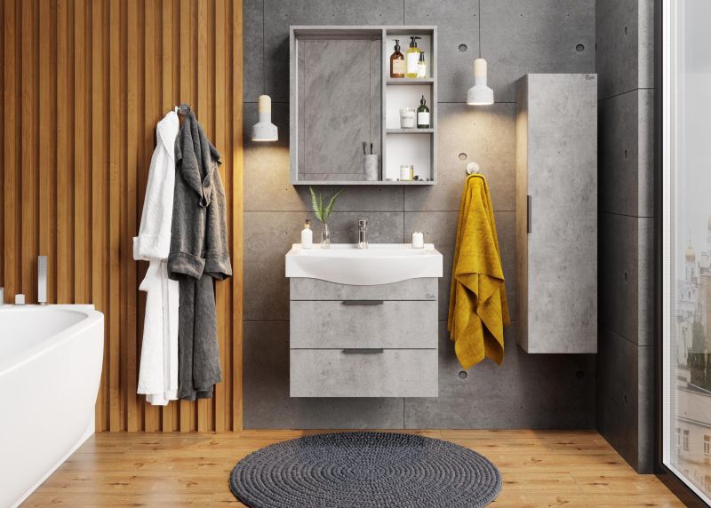 Навесной зеркальный шкаф для ванной комнаты Onika ДЕВИС 65 отличается чёткой геометрией форм и создан для тех, кто ценит современный лаконичный дизайн, холодный брутальный эффект бетона, а также безупречное исполнение.