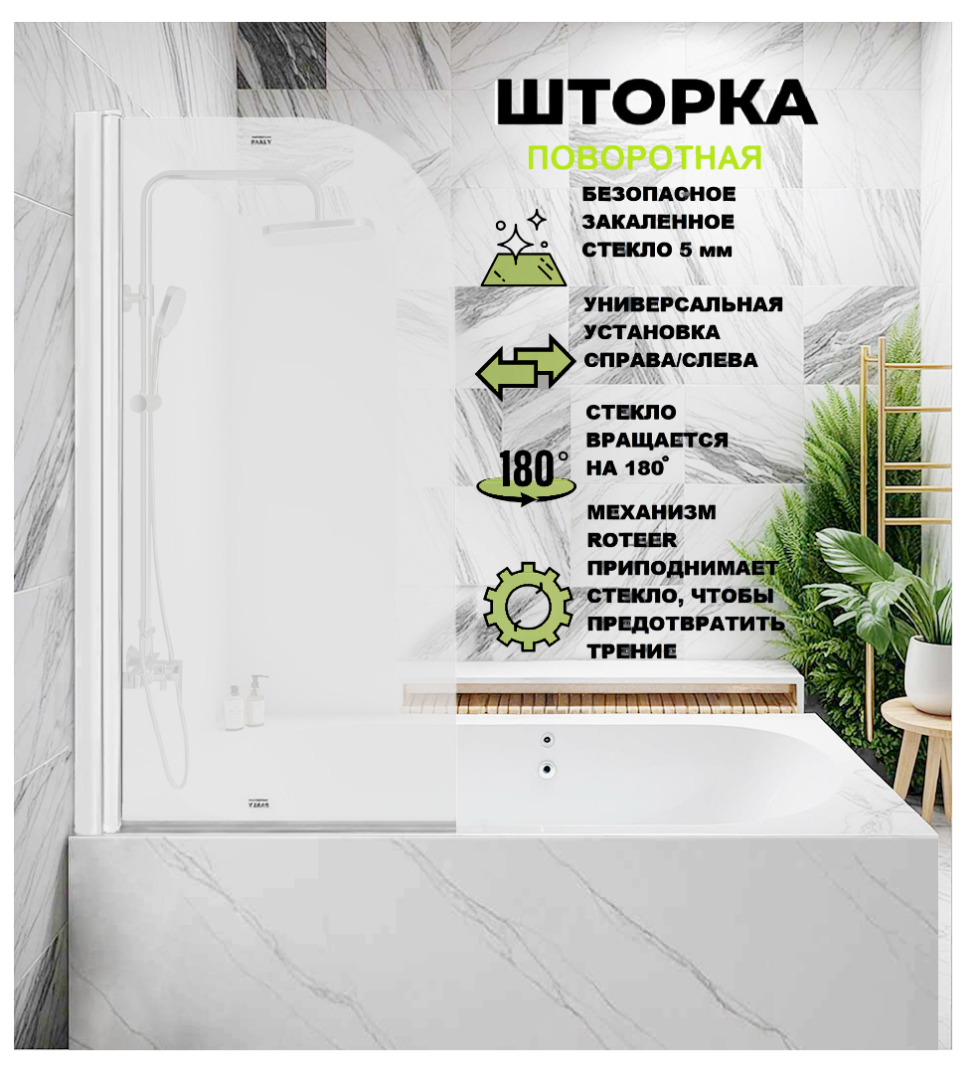 Штора бренда PARLY универсальна: она может быть установлена с любой стороны ванны. Штора имеет Механизм «roteer», который немного приподнимает стекло, чтобы предотвратить трение и сохранить уплотнитель в целости для идеальной герметичности, а также позволяет вращать стекло на 180°.