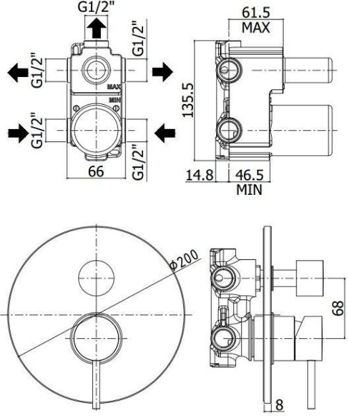 Смеситель встраиваемый для душа на 3 выход с накладкой из металла диам.200мм, девиатор-картридж, 3 положения+3 комбо,Черный матовыйСмеситель для душа Paffoni Light LIG019NO (с внутренней частью) предназначен для душа. Своим ярким дизайном и цветом он внесет в интерьер помещения стильный акцент, подчеркнув его своеобразие. Он изготовлен из надежного материала латунь, который не подвержен коррозии, а потому прослужит верой и правдой. Изделие является прекрасным примером продуманной конструкции. Управление в смесителе предусмотрено однорычажное, что порадует любителей такого типа смесителей. Высокую жизнеспособность и долговечность смесителю гарантирует керамический картридж, отличительной чертой которого является проработанная конструкция - залог безупречной работы в течение длительного времени. Не зря гарантия на смеситель – 5 лет, в течение которого компания Paffoni заверяет в его бесперебойной работе. Форма излива в смесителе - нет, а тип - нет. При покупке учтите, что подводка у смесителя жесткая, что необходимо знать для его монтажа.