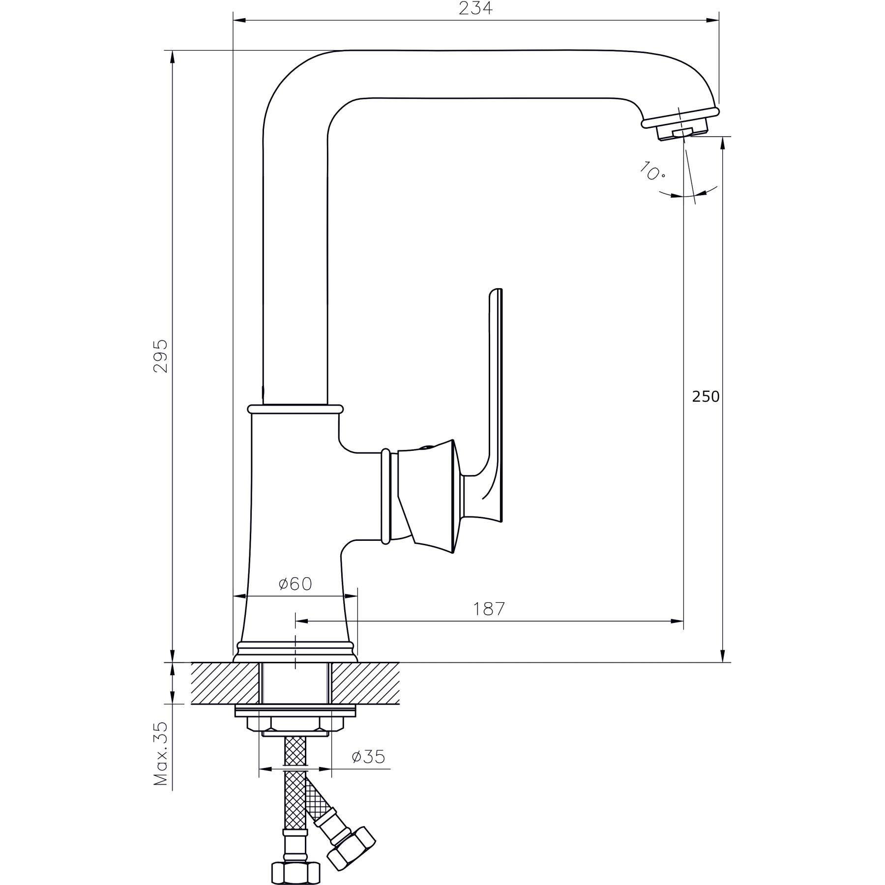 Смеситель для кухни с поворотным изливом RUSH арт. FLG0835-2 с металлической ручкой из коллекции Flores изготовлен из высококачественной латуни и имеет рычажное управление.В смеситель установлен картридж D-35 с керамическими пластинами. Высота смесителя 295 мм. Излив поворотный, 187 мм. Высота излива до аэратора 253 мм. Аэратор изготовлен из пластика с нержавеющим корпусом, угол наклона аэратора- 10 гр. В комплекте гибкая подводка с латунными гайками 45 см - 2шт, универсальная присоединительная группа для установки на горизонтальную поверхность, фум-лента, индивидуальный пакет, паспорт, гарантийный талон.