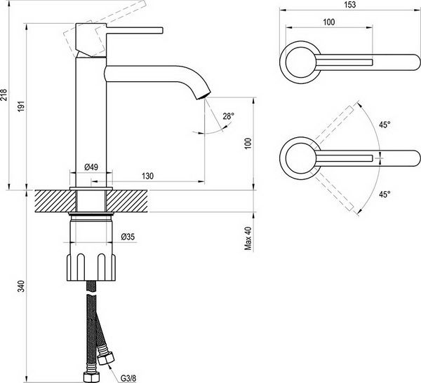 - соединительные шланги: гибкие 450 мм, диаметр DN6, G3/8