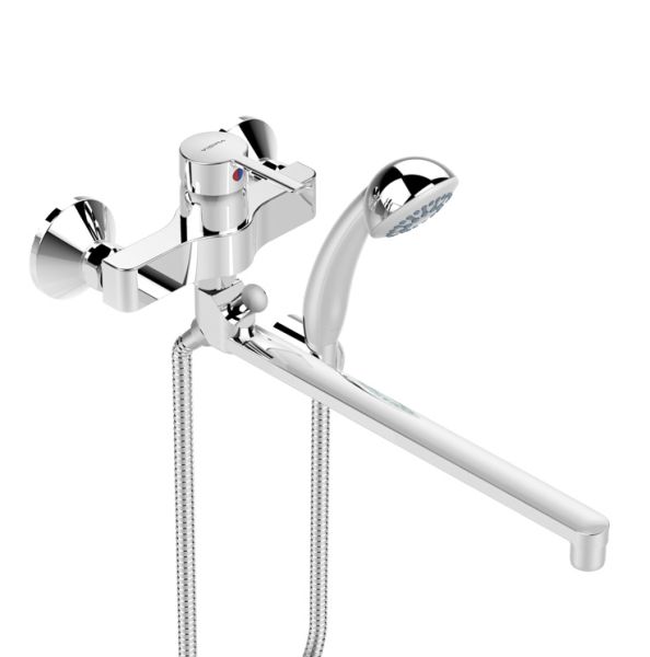 LOGIK Настенный смеситель для ванны/душа, поворотный излив 320 мм, душевой гарнитур в комплекте (лейка 70 мм, метал.шланг 1500 мм, держатель для лейки).