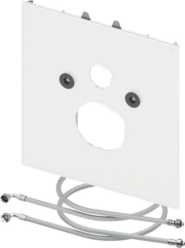 Нижняя стеклянная панель для унитазов TECEone с функцией биде, включая звукоизоляционный комплект и армированные шланги для подсоединения горячей и холодной воды к стандартным угловым вентилям. Стекло черное. Размеры (в x ш x г): 446 x 430 x 16 мм Примечание. Для подключения к предварительно установленным угловым вентилям.