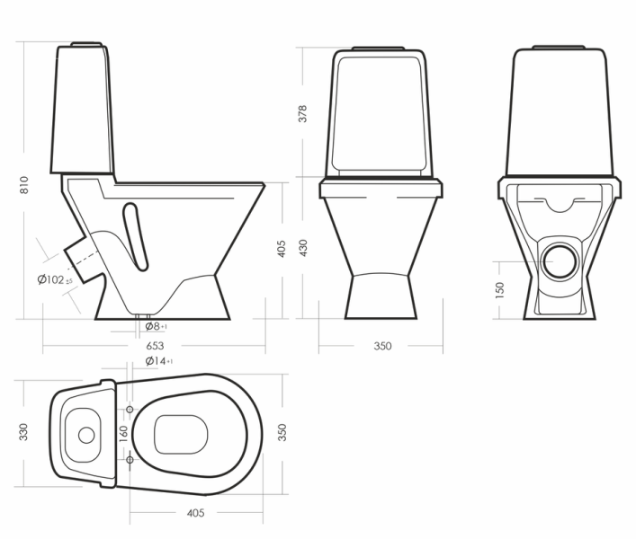 Размеры унитаза-компакта: 350 x 653 x 810